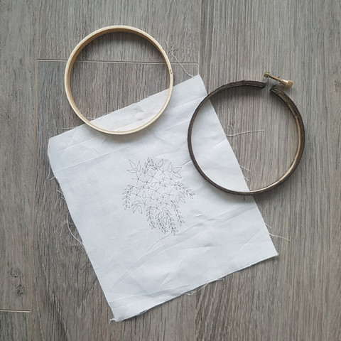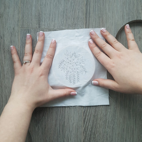 This might seem really obvious - unscrew the hoop, place the fabric over the inner hoop, and secure the outer hoop around it. Although it is a very simple technique, here are a few tips to perfect this method that will affect how your entire piece ends up.